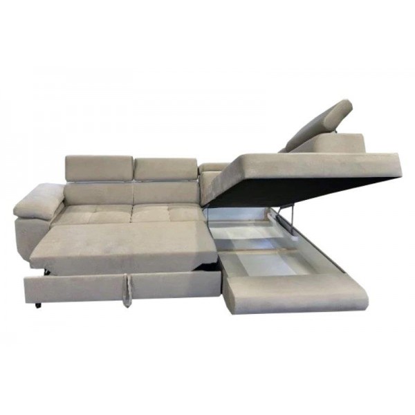magas fekhelyes, jobbos-balos állásban rendelhető, hátulja szövettel bevonva, hullámrugós, szövet, ágyazható, ágyneműtartós, állítható fejtámla, 250 - 300 cm szélesség között