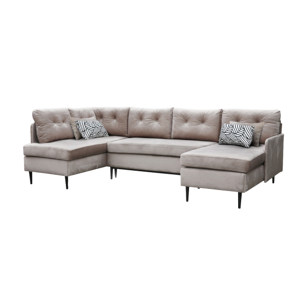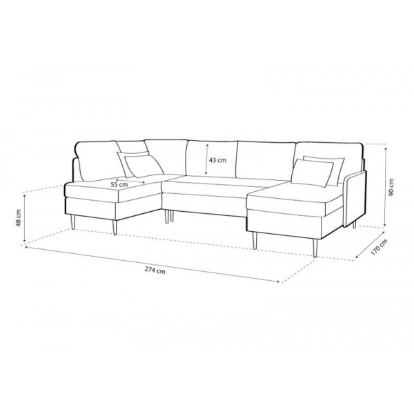külső méret: 274 x 170 cm, fekvőfelület: 270 x 140 cm, ülőmagasság: 48 cm, beülőmélység (párnával): 55 cm, háttámlamagasság: 43 cm, teljes magasság: 90 cmSzövetek