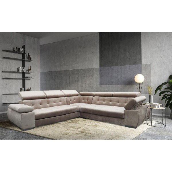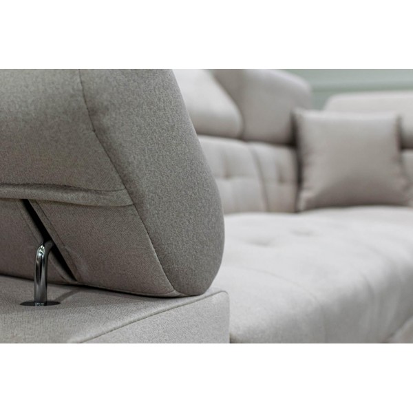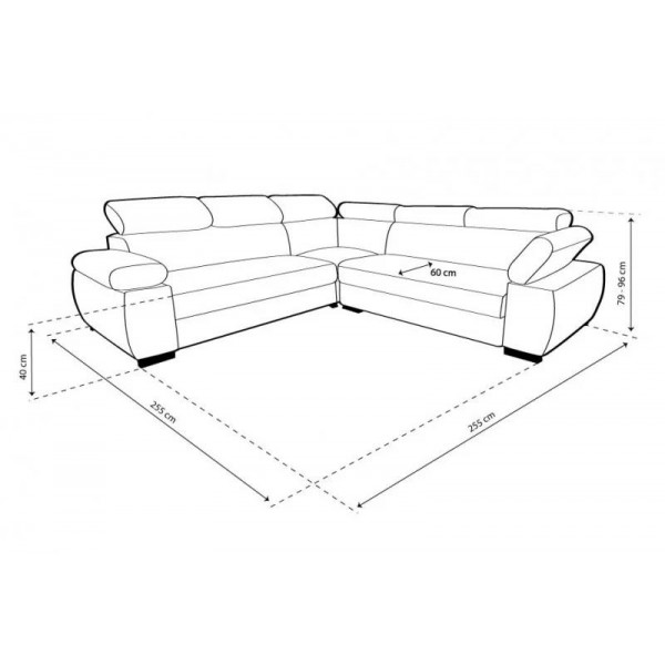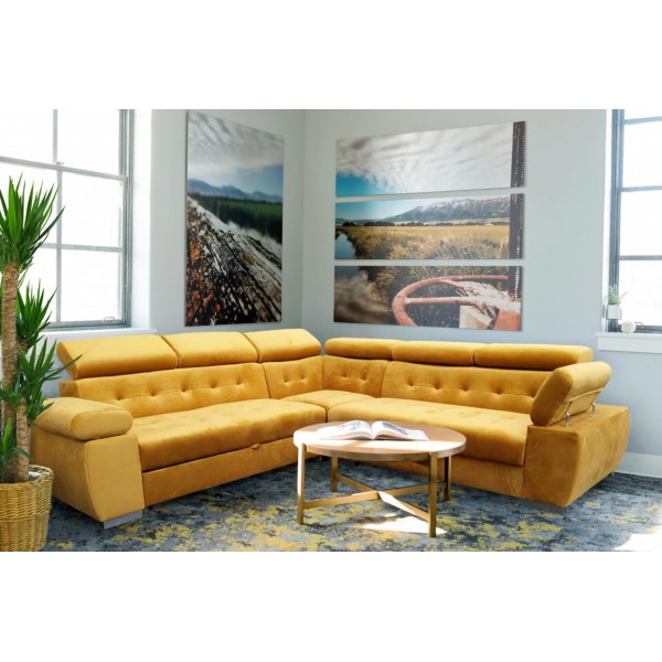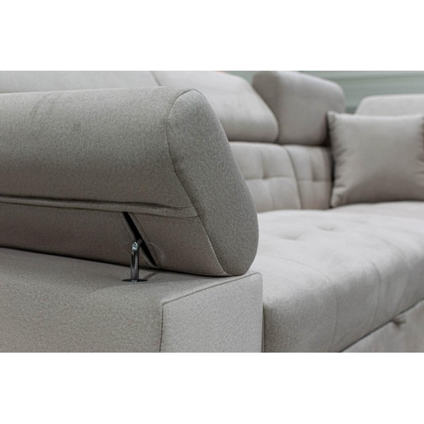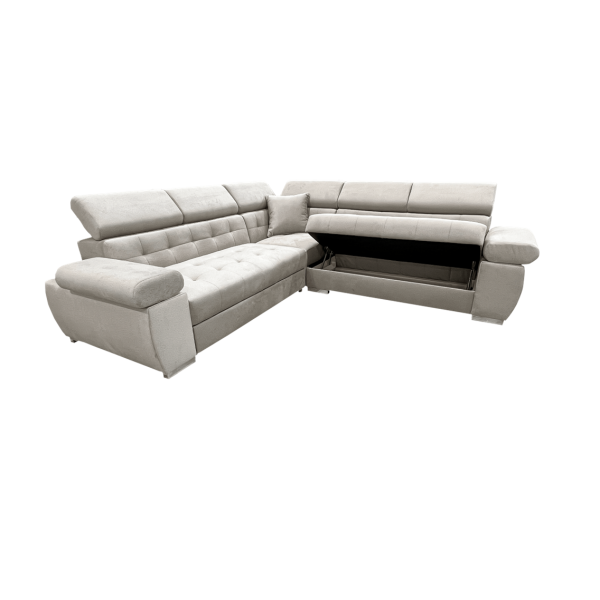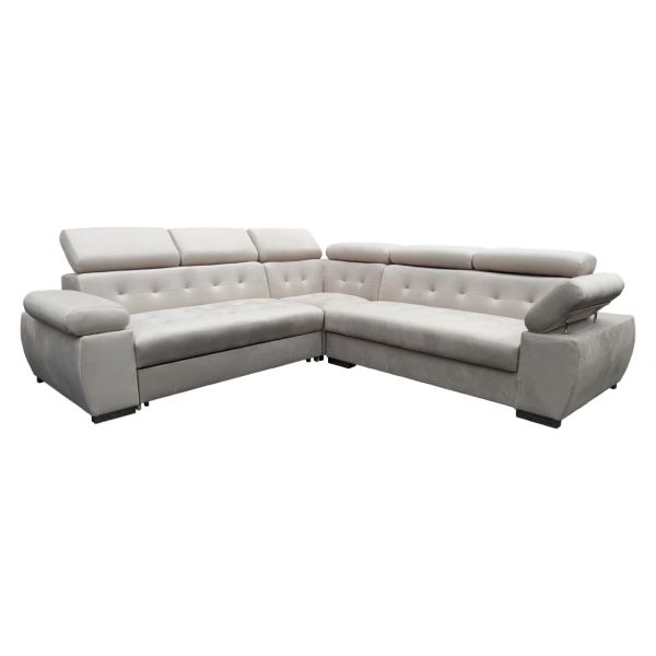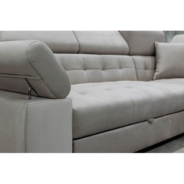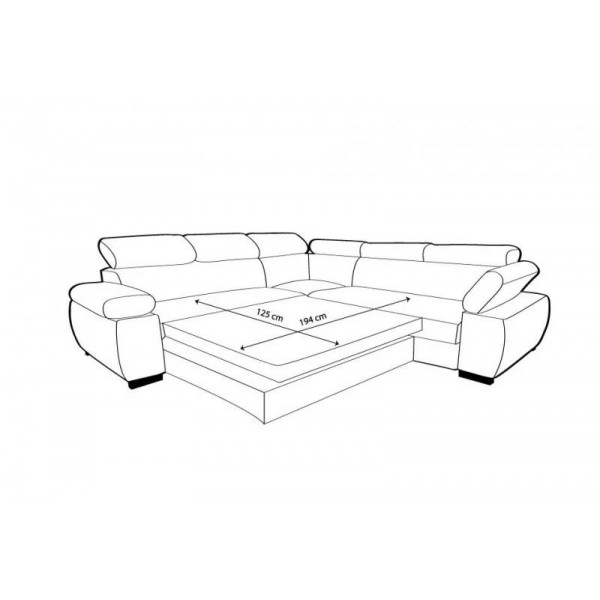 magas fekhelyes, jobbos-balos állásban rendelhető, hátulja szövettel bevonva, kiemelő mechanika, vízlepergető szövet, hullámrugós, ágyazható, ágyneműtartós, állítható fejtámla, állítható kartámla, 250 - 300 cm szélesség között