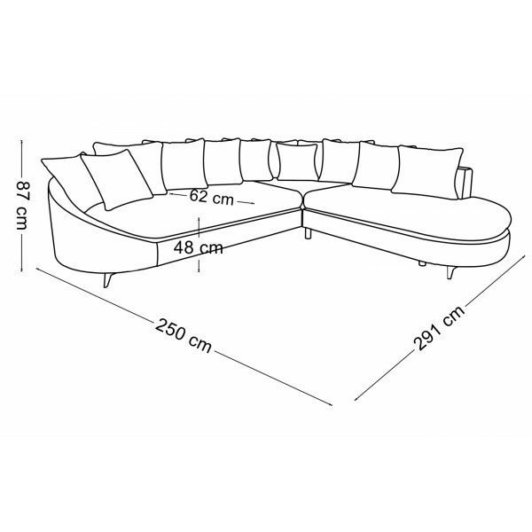 külső méret: 291 cm x 250 cm, fekvőfelület: 190 cm x 125 cm, ülőmagasság: 48 cm, beülőmélység (párnával): 62 cm, magasság: 87 cmSzövetek