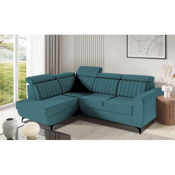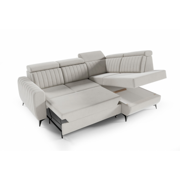 magas fekhelyes, jobbos-balos állásban rendelhető, automata kiemelő mechanika, hátulja szövettel bevonva, vízlepergető szövet, HR habszivacs, hullámrugós, ágyazható, ágyneműtartós, állítható fejtámla, 250 - 300 cm szélesség között