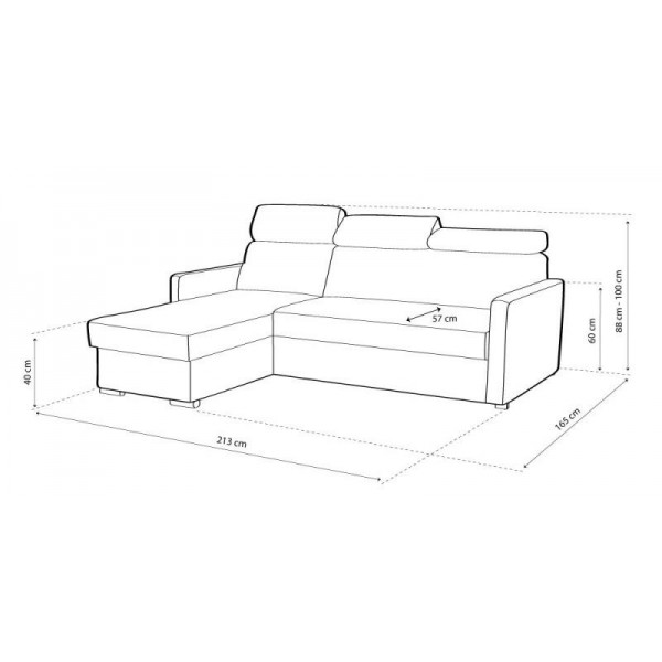 külső méret: 213 x 165 cm, fekvőfelület: 190 x 126 cm, teljes magasság: 88/100 cm, ülőmagasság: 40 cm, beülőmélység: 57 cm, háttámlamagasság: 60 cm