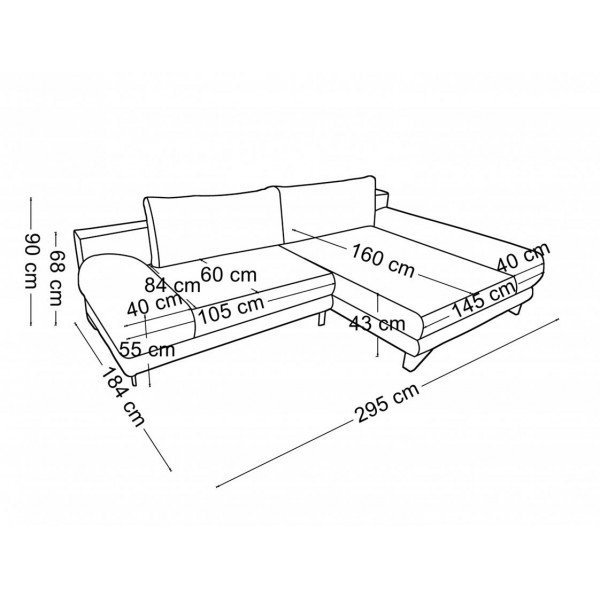 külso méret: 295 × 184 cm, fekvofelület: 228 x 130 cm, ülomagasság: 43 cm, beülomélység (párnával): 60 cm, teljes magasság: 90 cmSzövetek