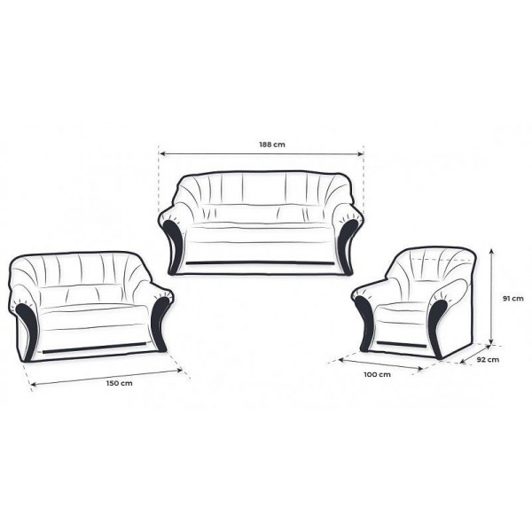 külső méret: 188 × 92 cm, fekvőfelület: 183 × 140 cm, háttámlamagasság: 91 cm, ülőmagasság: 43 cm, beülőmélység: 57 cm