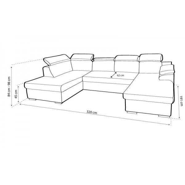 Külső méret: 320 cm X 191 cm X 191 cm Fekvőfelület: 128 cm X 260 cm Ülőmagasság: 45 cm Beülőmélység: 62 cm Teljes magasság: 84 cm – 98 cmSzövetek