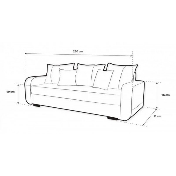 külső méret: 230 × 91 cm, fekvőfelület: 190 × 140 cm, ülőmagasság: 44 cm, beülőmélység (párnával): 55 cm, beülőmélység: 75 cm, háttámlamagasság: 74 cm - 3+2+1 garnitúra: