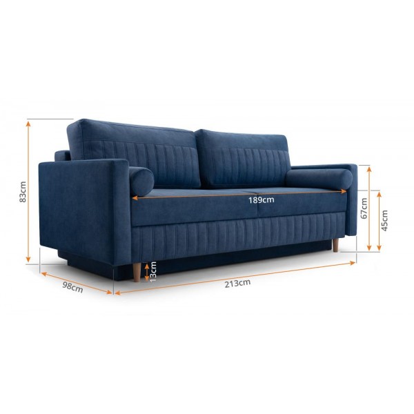külső méret: 213 × 100 cm, fekvőfelület: 153 x 189 cm, ülőmagasság: 45 cm, beülőmélység (párnával): 50 cm, teljes magasság: 83 cmSzövetek