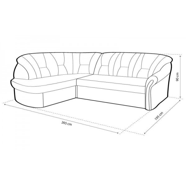 külső méret: 196 × 265 cm, fekvőfelület: 120 × 190 cm, ülőmagasság: 44 cm, beülőmélység: 50 cm, háttámlamagasság: 90 cmSzövetek