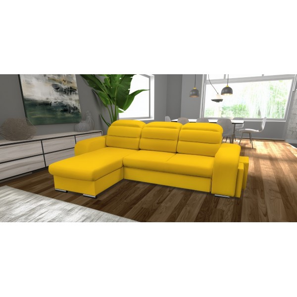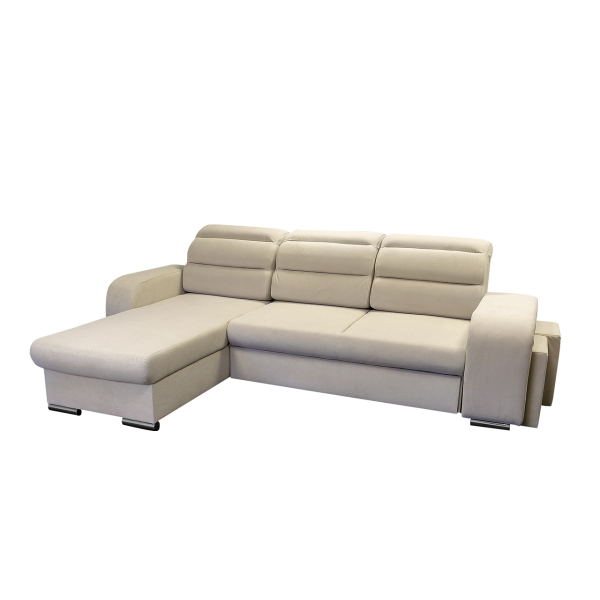magas fekhelyes, univerzális, hátulja szövettel bevonva, karjában puff található, hullámrugós, szövet, ágyazható, ágyneműtartós, állítható fejtámla, 250 - 300 cm szélesség között