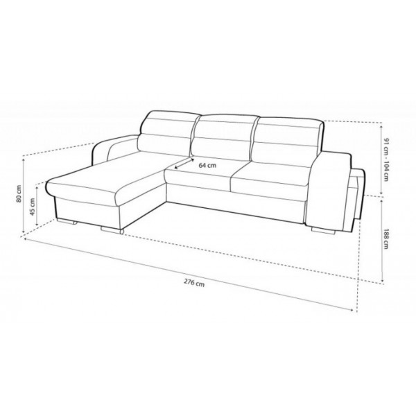 külső méret: 276 x 188 cm, fekvőfelület: 213 x 126 cm, ülőmagasság: 45 cm, beülőmélység: 64 cm, háttámlamagasság: 80 cm, magasság: 91-104 cmSzövetek