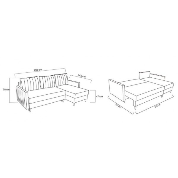 külső méret: 230 × 145 cm, fekvőfelület: 140 x 210 cm, beülőmélység: 78 cm, beülőmélység (párnával): 56 cm, ülőmagasság: 47 cm, teljes magasság: 78 cmSzövetek