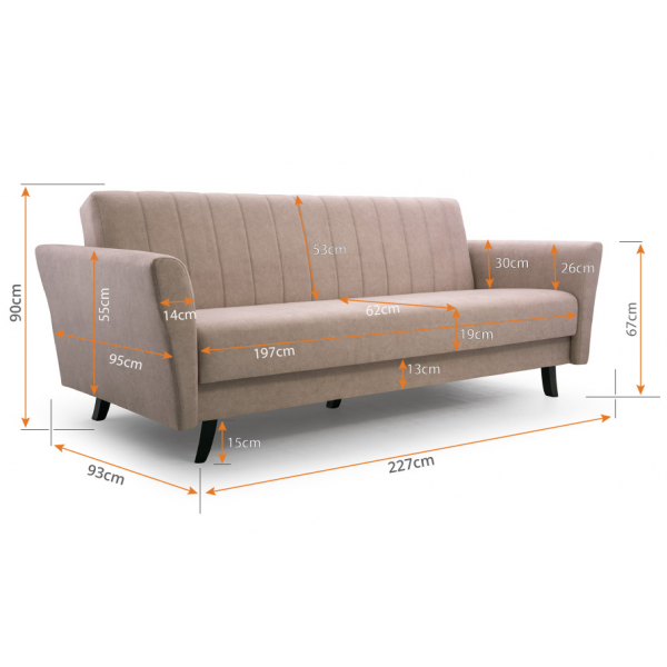 külső méret: 227 × 93 cm, fekvőfelület: 118 x 195 cm, ülőmagasság: 47 cm, beülőmélység (párnával): 62 cm, háttámla magasság: 53 cm, teljes magasság: 90 cmSzövetek