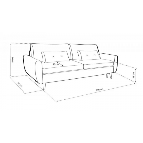 külső méret: 230 x 98 cm, fekvőfelület: 200 x 140 cm, ülőmagasság: 48 cm, beülőmélység (párnával): 55 cm, teljes magasság: 90 cm - 3+1+1 garnitúra: