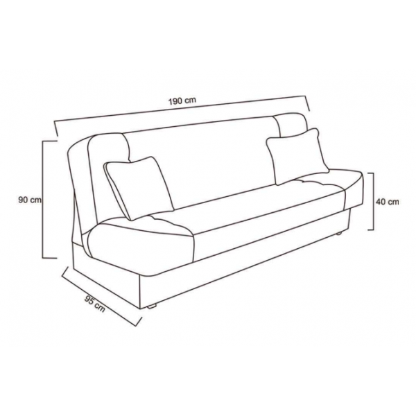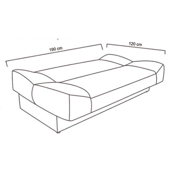 külső méret: 190 × 95 cm, fekvőfelület: 190 x 120 cm, ülőmagasság: 40 cm, beülőmélység: 55 cm, háttámlamagasság: 90 cmSzövetek