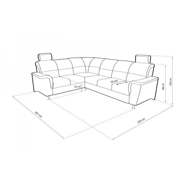 külső méret: 267 x 220 cm, fekvőfelület: 201 x 117 cm, ülőmagasság: 43 cm, beülőmélység: 54 cm, háttámlamagasság: 88 cm, magasság: 106 cmSzövetek