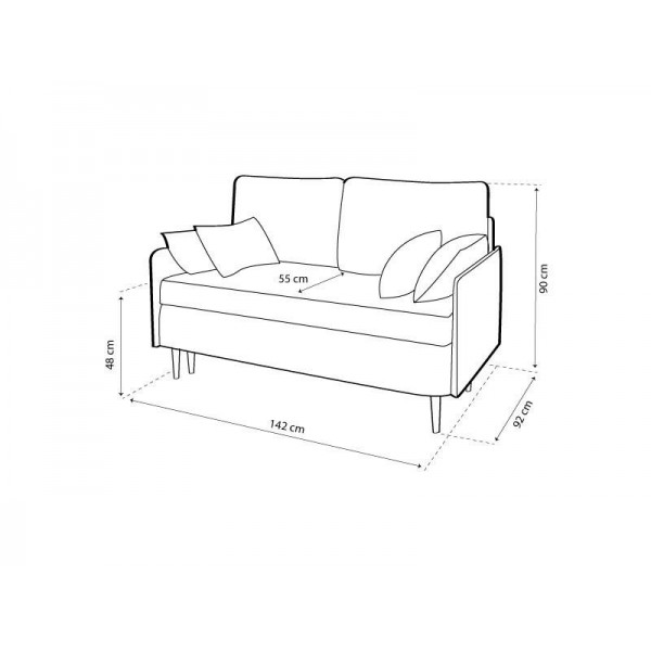 külső méret: 142 x 92 cm, ülőmagasság: 48 cm, beülőmélység (párnával): 55 cm, teljes magasság: 90 cm