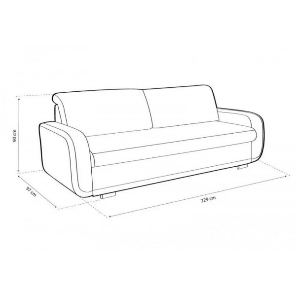 külső méret: 229 × 97 cm, fekvőfelület: 190 × 143 cm, ülőmagasság: 45 cm, beülőmélység: 78 cm, beülőmélység (párnával): 58 cm, háttámlamagasság: 90 cm