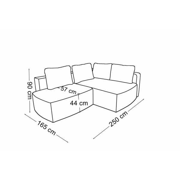 külső méret: 250 cm x 165 cm, fekvőfelület: 197 cm x 124 cm, ülőmagasság: 44 cm, beülőmélység (párnával): 57 cm, magasság: 90 cm