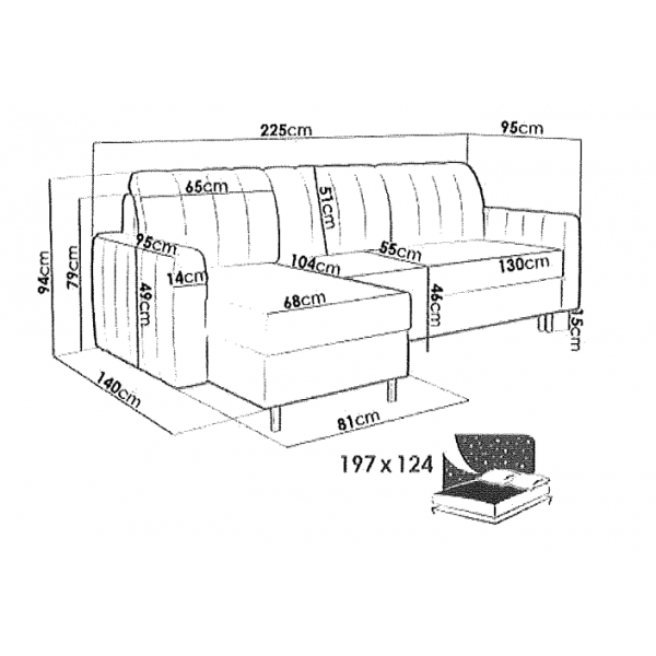 külső méret: 225 × 140 cm, fekvőfelület: 197 x 124 cm, beülőmélység (párnával): 55 cm, ülőmagasság: 46 cm, teljes magasság: 94 cmSzövetek