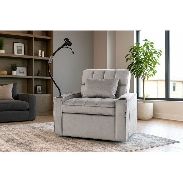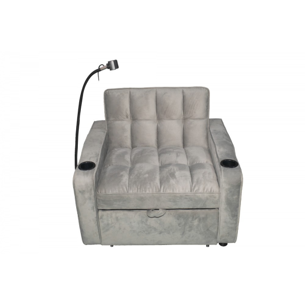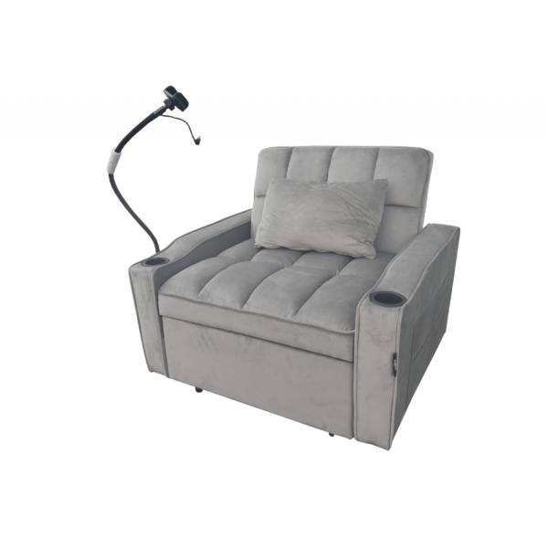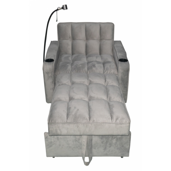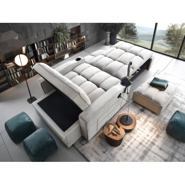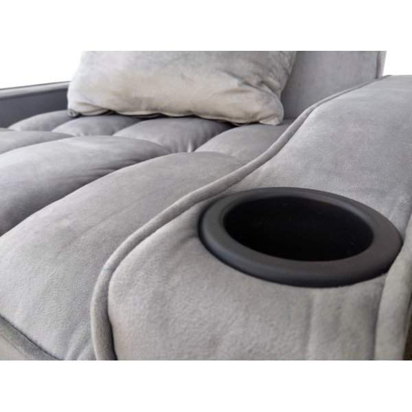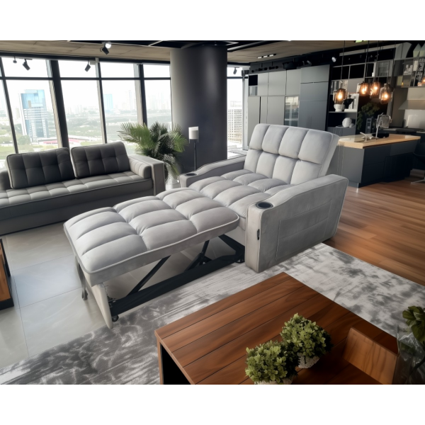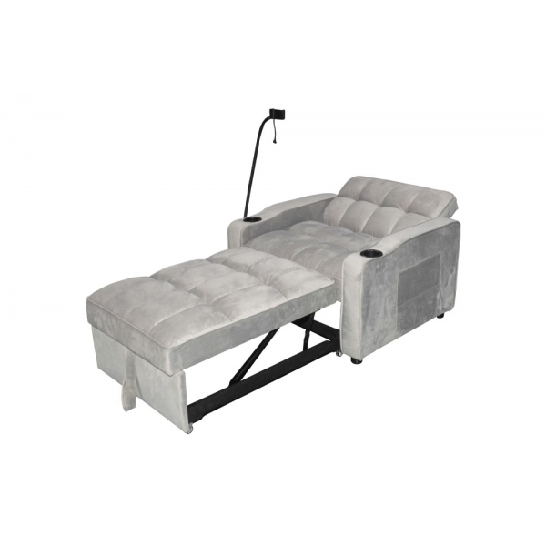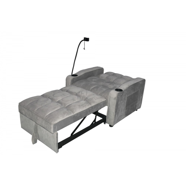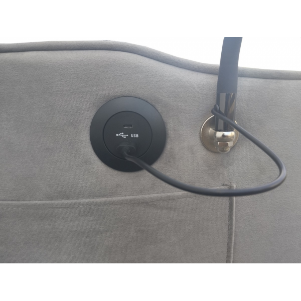 magas fekhelyes, kiemelő mechanika, hosszirányú fekvés!, karfáján zseb található, három pozícióban állítható háttámla, dupla pohártartó, flexibilis telefontartó, USB-C töltő a telefontartón, USB-C töltő a karfán, hullámrugós, szövet, ágyazható