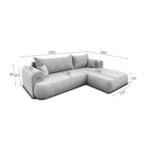 külső méret: 180 × 280 cm, fekvőfelület: 230 × 160 cm, ülőmagasság: 40 cm, beülőmélység (párnával): 78 cm, beülőmélység: 90 cm, háttámla magasság: 70 cm, teljes magasság: 85 cm
