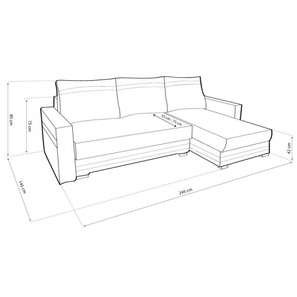 külső méret: 245 × 145 cm, fekvőfelület: 210 x 140 cm, ülőmagasság: 42 cm, beülőmélység (párnával): 55 cm, beülőmélység: 75 cm, háttámlamagasság: 75 cm, teljes magasság (párnával:) 85 cmSzövetek