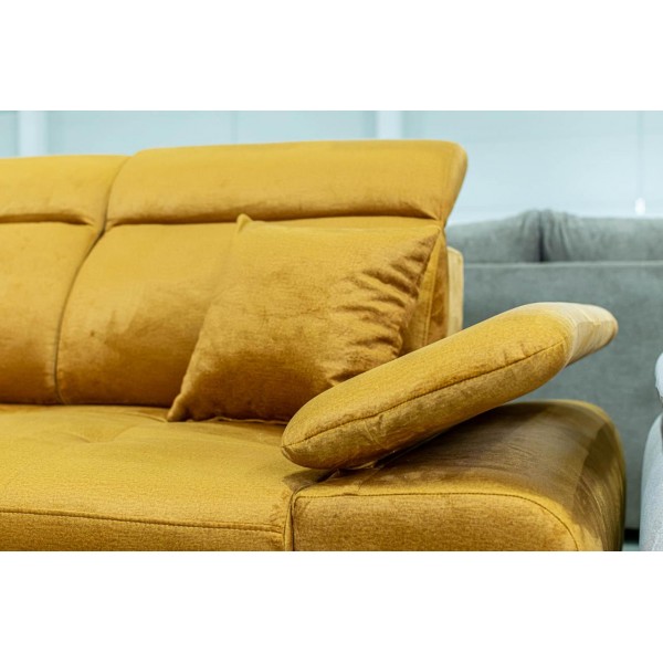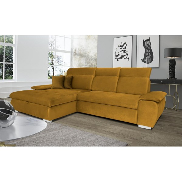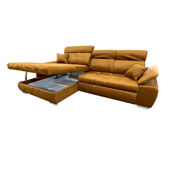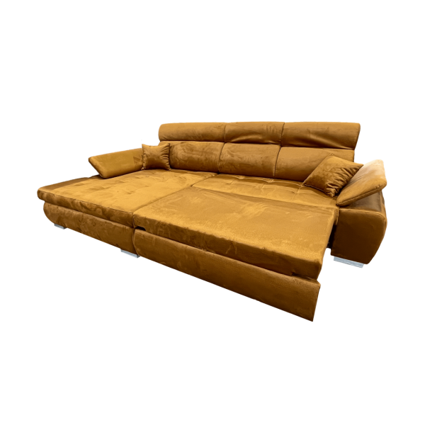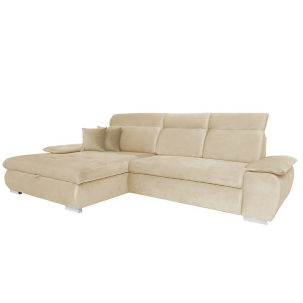 magas fekhelyes, jobbos-balos állásban rendelhető, hátulja szövettel bevonva, kiemelő mechanika, vízlepergető szövet, hullámrugós, ágyazható, ágyneműtartós, állítható fejtámla, állítható kartámla, 250 - 300 cm szélesség között