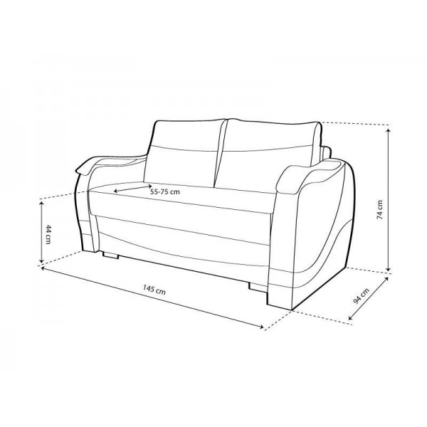 külső méret: 145 × 94 cm, ülőmagasság: 44 cm, beülőmélység (párnával): 55 cm, beülőmélység: 75 cm, háttámlamagasság: 74 cmSzövetek