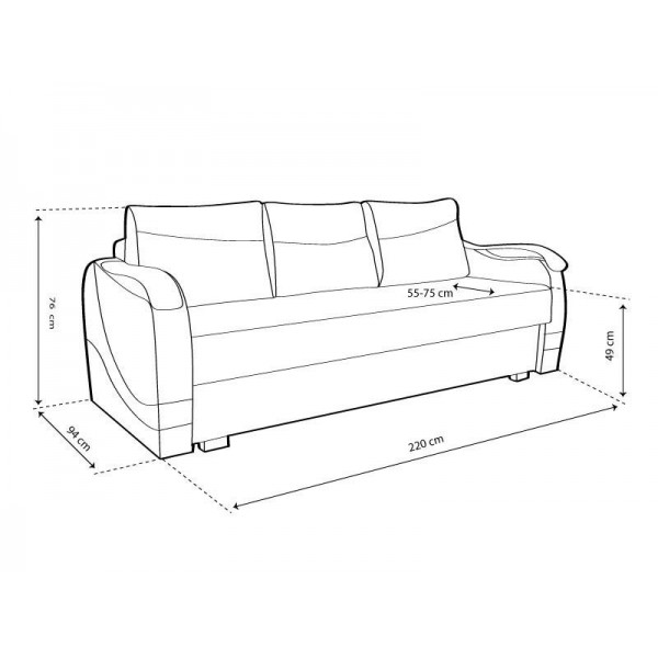 külső méret: 220 × 94 cm, fekvőfelület: 190 × 138 cm, ülőmagasság: 44 cm, beülőmélység (párnával): 55 cm, beülőmélység: 75 cm, háttámlamagasság: 74 cm - :