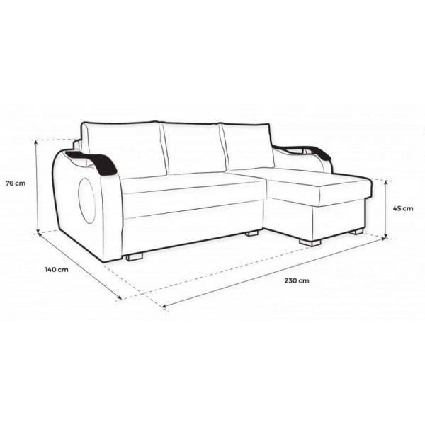 külső méret: 140 × 230 cm, fekvőfelület: 142 × 200 cm, ülőmagasság: 45 cm, beülőmélység (párnával): 55 cm, beülőmélység: 76 cm, háttámlamagasság: 76 cmSzövetek