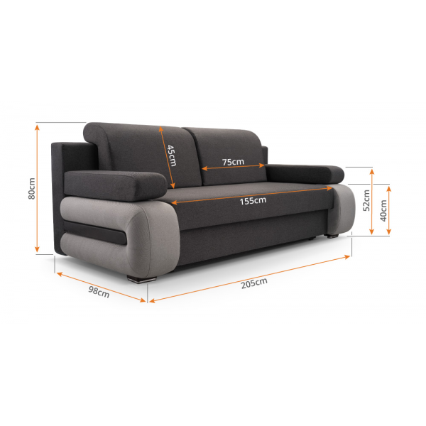 külső méret: 205 × 98 cm, fekvőfelület: 196 x 142 cm, ülőmagasság: 40 cm, beülőmélység (párnával): 55 cm, háttámla magasság: 45 cm, teljes magasság: 80 cmSzövetek