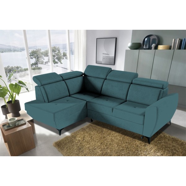 magas fekhelyes, jobbos-balos állásban rendelhető, hátulja szövettel bevonva, kiemelő mechanika, vízlepergető szövet, HR habszivacs, hullámrugós, ágyazható, ágyneműtartós, állítható fejtámla, 250 - 300 cm szélesség között