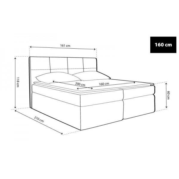 külső méret: 161 x 210 cm, fekvőfelület: 160 x 200 cm, fekvőfelület magasság: 60 cm, magasság: 118 cm, matrac vastagság: 18 cm, fedőmatrac vastagság: 5 cmSzövetek