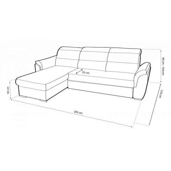 Külső méret: 265 cm X 179 cm Ülőmagasság: 42 cm Beülőmélység: 55 cm Teljes magasság: 90 cm – 104 cm Fekvőfelület: 213 cm X 121 cmSzövetek