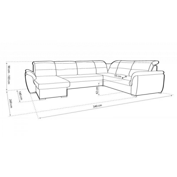 Külső méret: 340 cm X 260 cm X 180 cm Ülőmagasság: 42 cm Beülőmélység: 55 cm Teljes magasság: 90 cm – 104 cm Fekvőfelület: 120 cm X 262 cmSzövetek