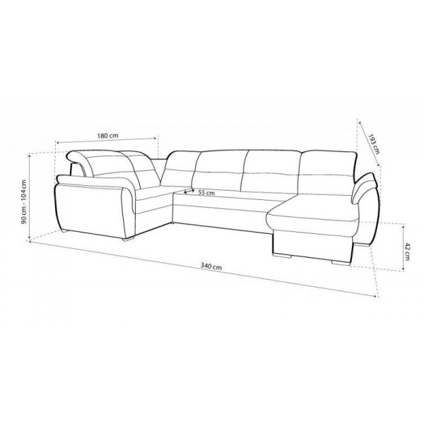 Külső méret: 340 cm X 193 cm X 180 cm Ülőmagasság: 42 cm Beülőmélység: 55 cm Teljes magasság: 90 cm – 104 cm Fekvőfelület: 120 cm X 262 cmSzövetek