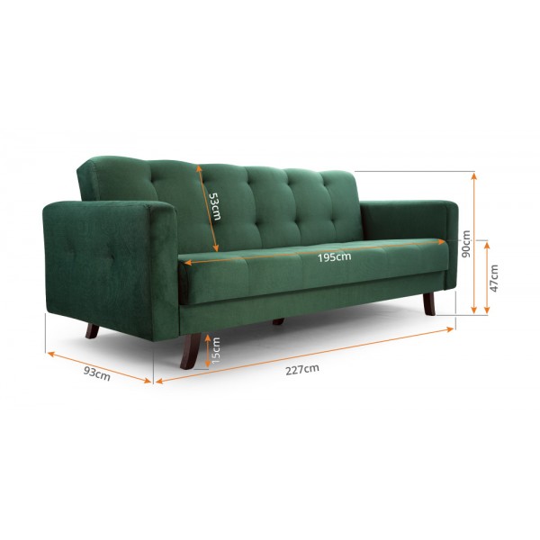 külső méret: 227 × 93 cm, fekvőfelület: 118 x 195 cm, ülőmagasság: 47 cm, beülőmélység (párnával): 62 cm, teljes magasság: 90 cmSzövetek